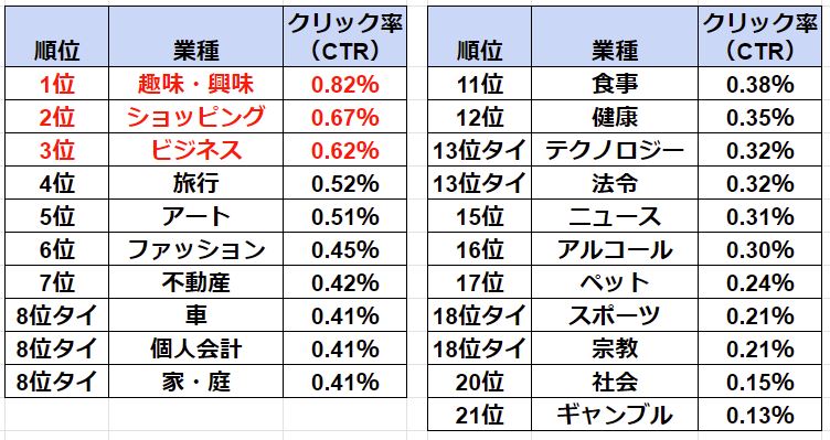 自分が扱う商品やサービスがどの業種分類になるのか確認して、目安としてクリック率を認識しておきましょう。